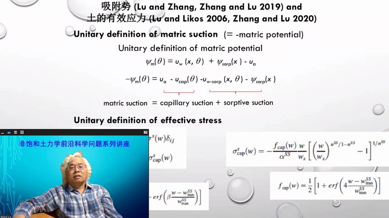 9月16日至11月18日,应新葡萄88805官网邀请,美国科罗拉多矿业大学Ning Lu(卢宁)教授开设的18讲“非饱和土力学前沿科学问题系列云讲座”落幕,该系列讲座聚焦于非饱和土力学前沿领域,围绕土的吸附势(Soil sorptive potential)与土的有效应力(Soil effective stress)2大主题,18讲内容分别为: