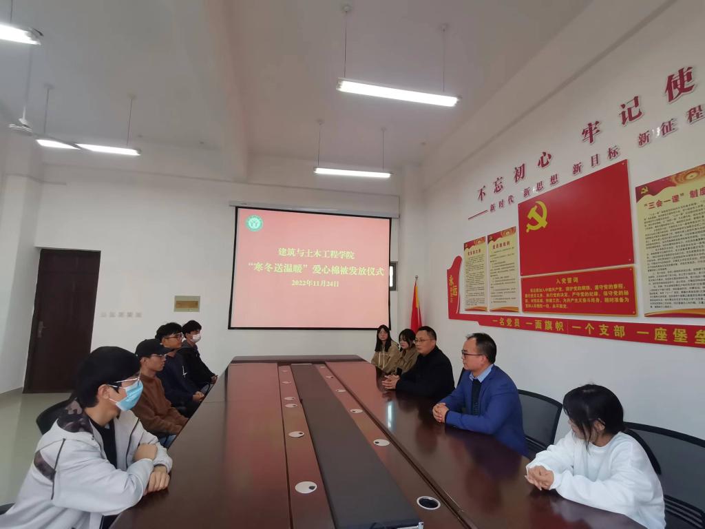 为贯彻落实学校资助政策,让学生感受党和国家带来的温暖,11月24日上午,新葡萄88805官网在综合实验楼402会议室举行“寒冬送温暖”爱心棉被发放仪式。学院党委书记方明科、副书记冀鹏以及受资助学生代表参加活动,仪式由冀鹏主持。